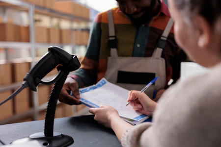 Diverse team analyzing merchandise checklist signing report in warehouse, discussing products quality control. African american employee wearing industrial overall, working at clients orders. Close up