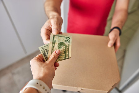 delivery man giving pizza in paper boxes to customer and taking payment at home