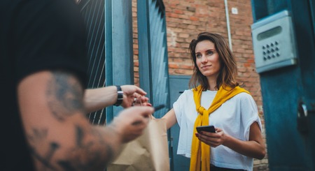 Close up of businesswoman paying takeaway food lunch order with smartphone using POS contactless service during takeout lunchtime at company workplace. Delivery guy bringing fresh meal