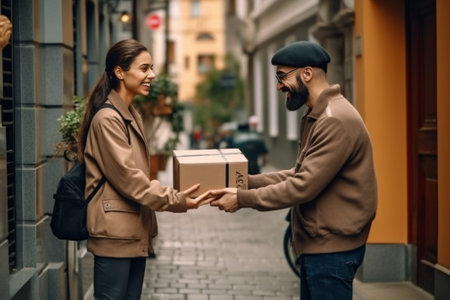 Fast and reliable service Cheerful young delivery man giving a cardboard box to young woman while standing at the entrance of her apartment : Generative AI