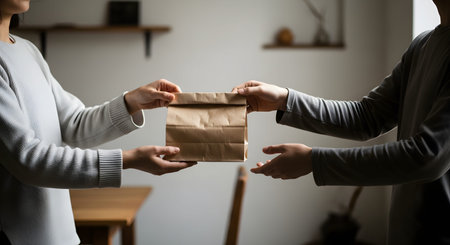 Two individuals are depicted in the act of handing over a plain brown paper bag from one to the other. This scene represents concepts of food delivery, gift giving, or sharing in a casual indoor environment.
