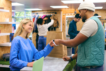 Male Customer Paying Female Sales Assistant In Fashion Store Using Contactless Payment With Card