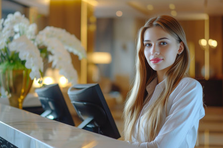Elegant Receptionist Welcoming Guests at Exclusive Five-Star Hotel