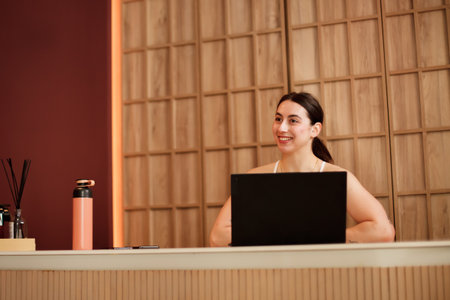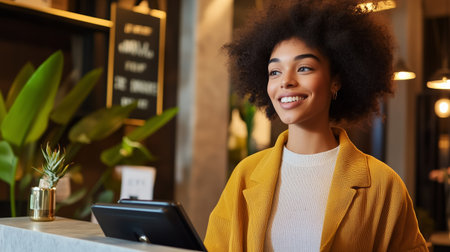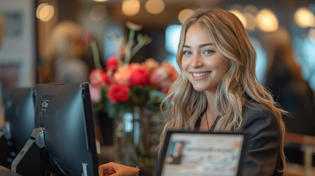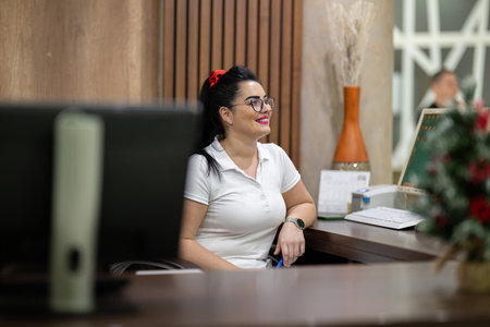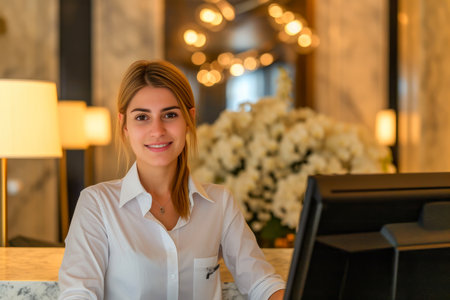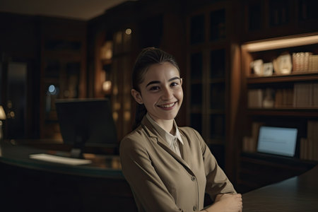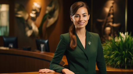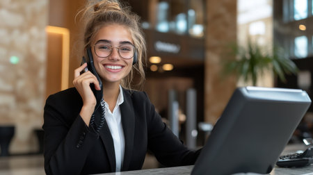 Polished Receptionist Exuding Warmth and Professionalism in High-End Hospitality