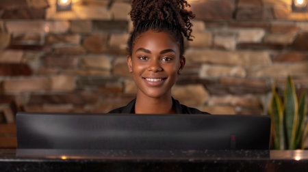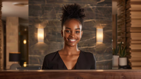 Smiling woman stands at reception desk in modern hotel lobby, showcasing welcoming atmosphere. elegant decor features stone walls and soft lighting, creating warm ambiance