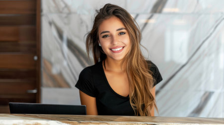 A friendly young receptionist with long wavy hair smiles warmly at the front desk, working in a modern and stylish office or hotel lobby