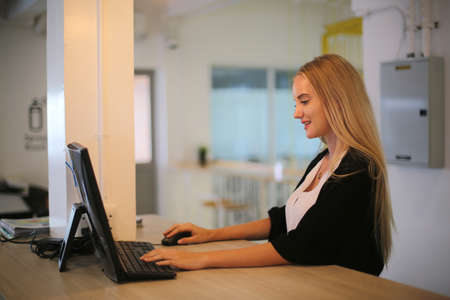 friendly young woman behind the reception desk administrator