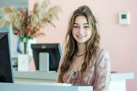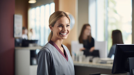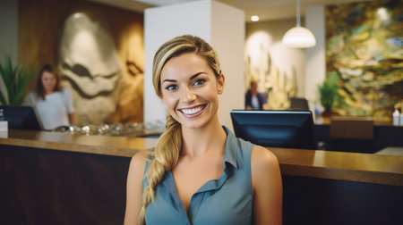 Friendly receptionist smiling at front desk, showcasing welcoming atmosphere and professional demeanor. warm smile and approachable nature create positive first impression