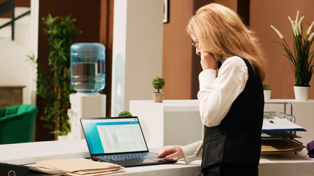 Receptionist answering phone at hotel front desk