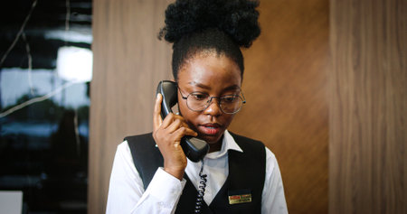 Portrait of busy successful woman working as receptionist in luxury hotel. Attractive African-American female receptionist receiving calls talking on phone. Friendly young hotel administrator.