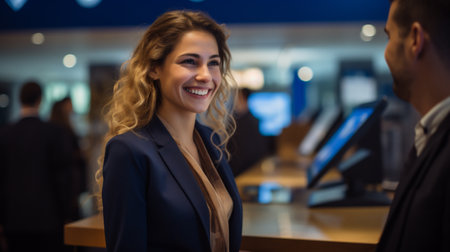 Portrait of smiling young lady from hotel front desk receptionist. Generative AI