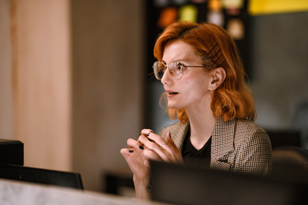 Young woman with orange hair engages in a discussion while sitting at a desk in a modern office environment during the day