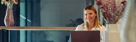 Smiling woman at a reception desk working on her laptop in a modern office space during the afternoon