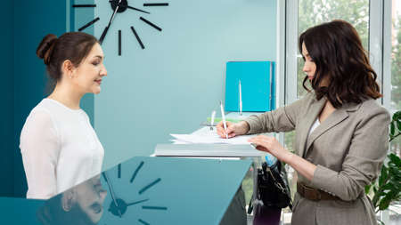 Lady office manager in white blouse shows registration book to woman client standing at reception in contemporary hospital side view