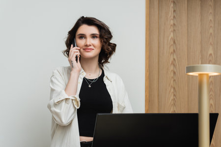 pleased young woman in stylish casual clothes, with wavy brunette hair and tattoo talking on telephone while working as receptionist at front desk near computer monitor and lamp in hotel lobby