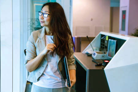 Beautiful woman working on a laptop at the airport.