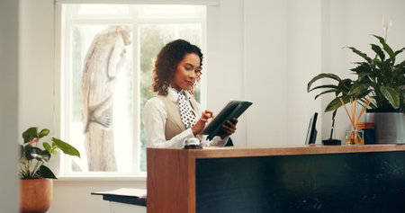 Hotel, receptionist and woman with tablet, browsing and checking reservation on website or schedule. Motel, concierge and person with tech for booking info, update and research for request on app