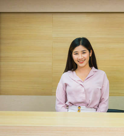 young woman look happy at reception counter for service customer, wood background