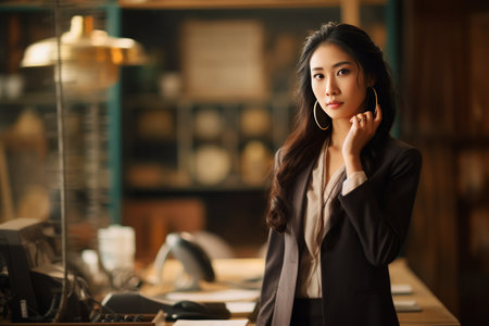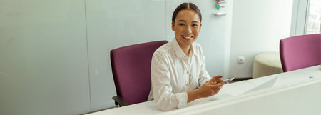 Smiling young asian female professional in office attire at reception desk