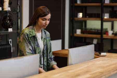 Portrait of young woman working at counter in music store and using computer, copy space