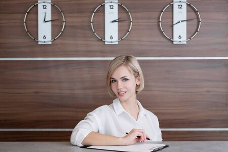 Young beautiful blonde girl with short hair in a white shirt. The receptionist at the reception desk at the hotel. Against the background of a clock with time zones from different continents.