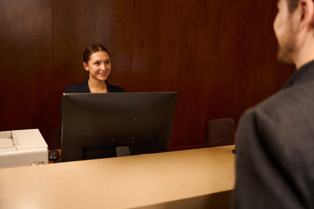 Smiling woman receptionist welcoming visitor at hotel