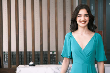 Portrait of friendly concierge receptionist behind the counter in the hotel.
