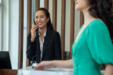 Receptionist talking on the phone while arranging accommodation for the customer