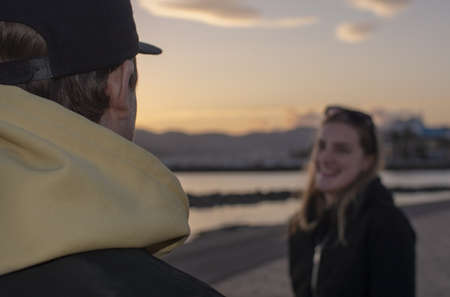 Over the shoulder shot of guy in yellow hood jacket to smiling woman blurry, casual looking couple with hood jackets watch sunset in Majorca, Spain.