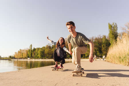 Young Caucasian couple teaching to each others while practicing skating, lifestyle extreme outdoor activity. People lifestyle recreation. Success team skating holding hands