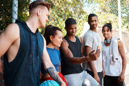 You guys have got to see this. Shot of a group of sporty young people looking at something on a cellphone while standing along a fence outdoors.