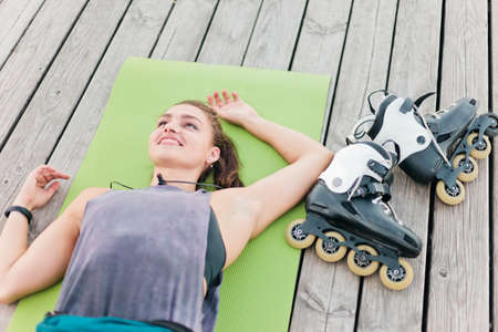Tired but happy woman roller skater resting lying on mat outdoors