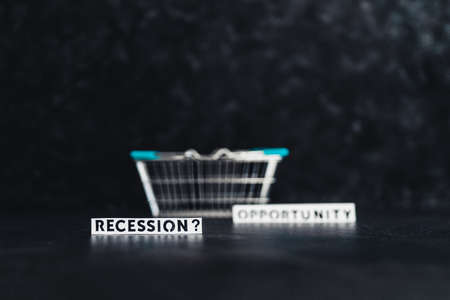 recession or opportunity texts wth shopping basket on dark background with only one in focus, shot at shallow depth of field