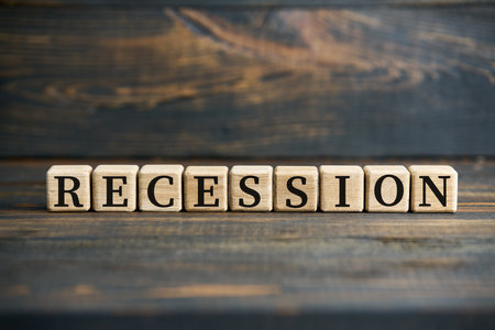 Wooden blocks with letters forming the word RECESSION, arranged on a rustic wooden surface.