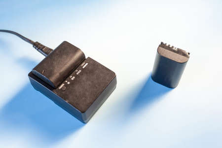 DSLR camera battery charger on blue background