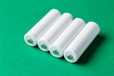 Used AA batteries and proper disposal of environmentally and soil-toxic batteries on a green background. The concept of processing harmful and recyclable objects.