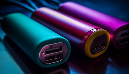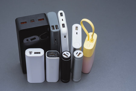 A group of power banks in various shapes, sizes, and colors on a table. Concept portable charging solutions, mobile technology, and on-the-go energy backup for smartphones and devices