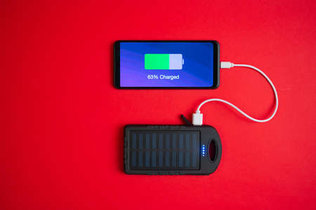 Modern smartphone charging clean energy solar battery powerbank top view on red background