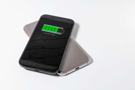 Black touchscreen smartphone wireless charging on induction charger. Wireless charger