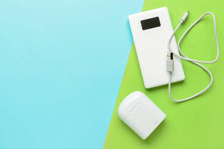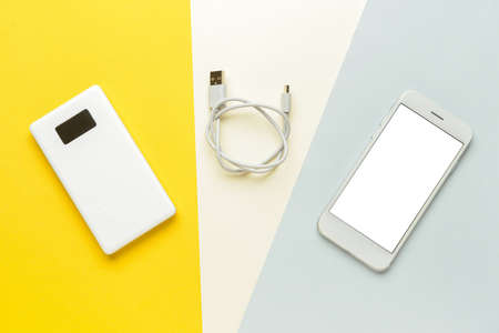 Power bank smartphone. Mobile phone or smartphone battery charging from portable powerbank with white usb cable. Modern technology concept in top view