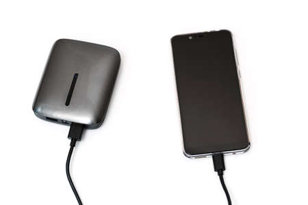 detail of smartphone charging from a portable power bank on a white background with prominent shadows
