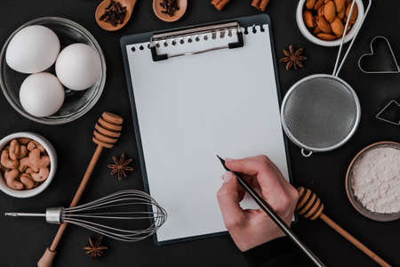 Baking cooking Ingredients on black background. Top view. Blank clipboard copy space. Home baking: cookies, bread, cake. Cinnamon sticks, nuts spices eggs flour