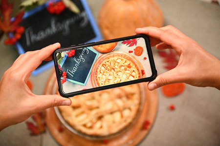 Selective focus. Woman hands hold a smartphone, takes a photo of a freshly baked pumpkin apple pie with a crispy lattice for a food blog. Thanksgiving concept. Autumn holiday. Phone in live view mode