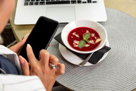 Top view of hands holding smartphone and photographing a pot with freshly cooked Ukrainian traditional soup- Borscht with greenery lying on a linen tablecloth. Mobile hone in live view mode