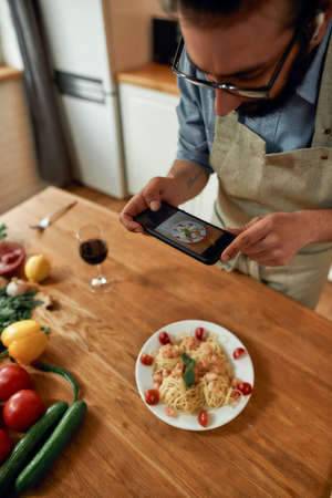 Delicious meal. Young man, cook taking picture of garlic butter shrimp pasta, meal decorated with basil and cherry tomatoes. Cooking at home, Mediterranean cuisine concept