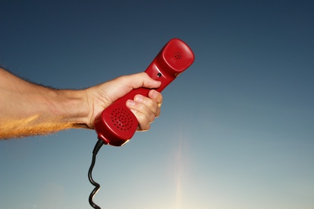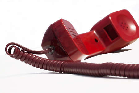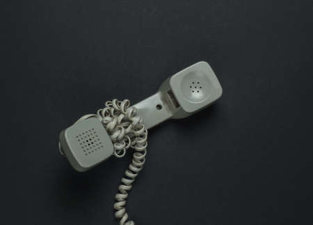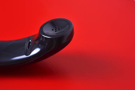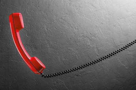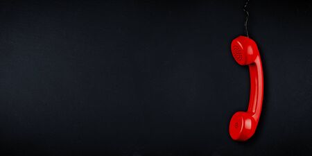 red colored old fashioned retro phone reciever with black telephone wire on dark slate blackboard background with copy space. business communication support service problem and solution concept
