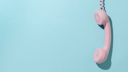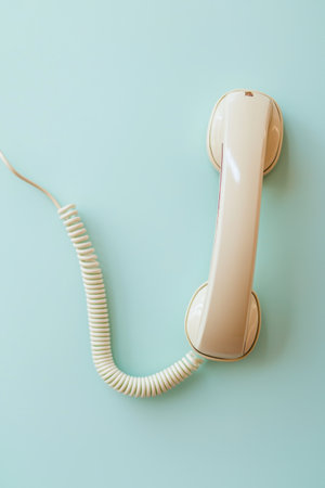 Beige vintage telephone receiver with a spiral cord resting on a pastel blue background, evoking nostalgia for retro communication and highlighting the charm of classic customer service