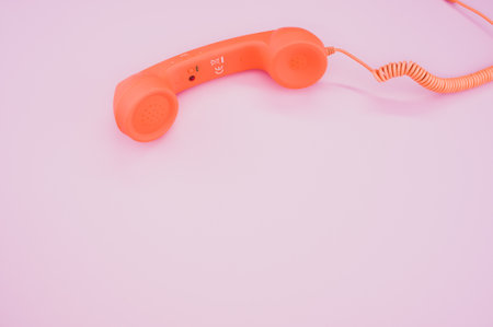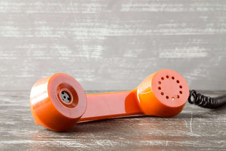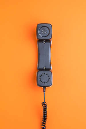 Inverted retro phone handset on an orange background. Flat lay. Retro communication equipment.
