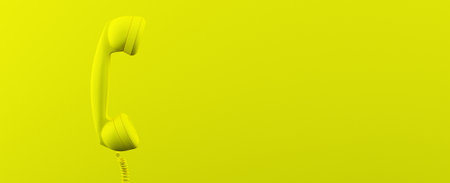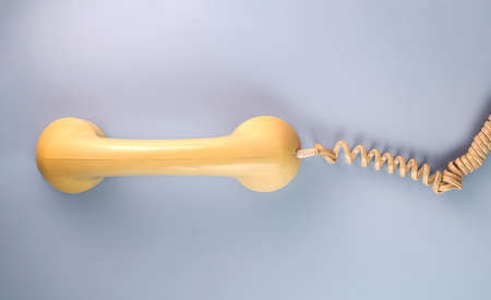 Yellow telephone receiver with twisted cord from an old antique rotary phone on blue background. Plastic removed handset from retro phone with cable. Concept of communication. Top view.