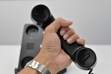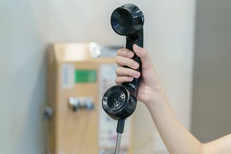 Woman hand holding a public phone, coin pay telephone on payphone tube or telephone booth.